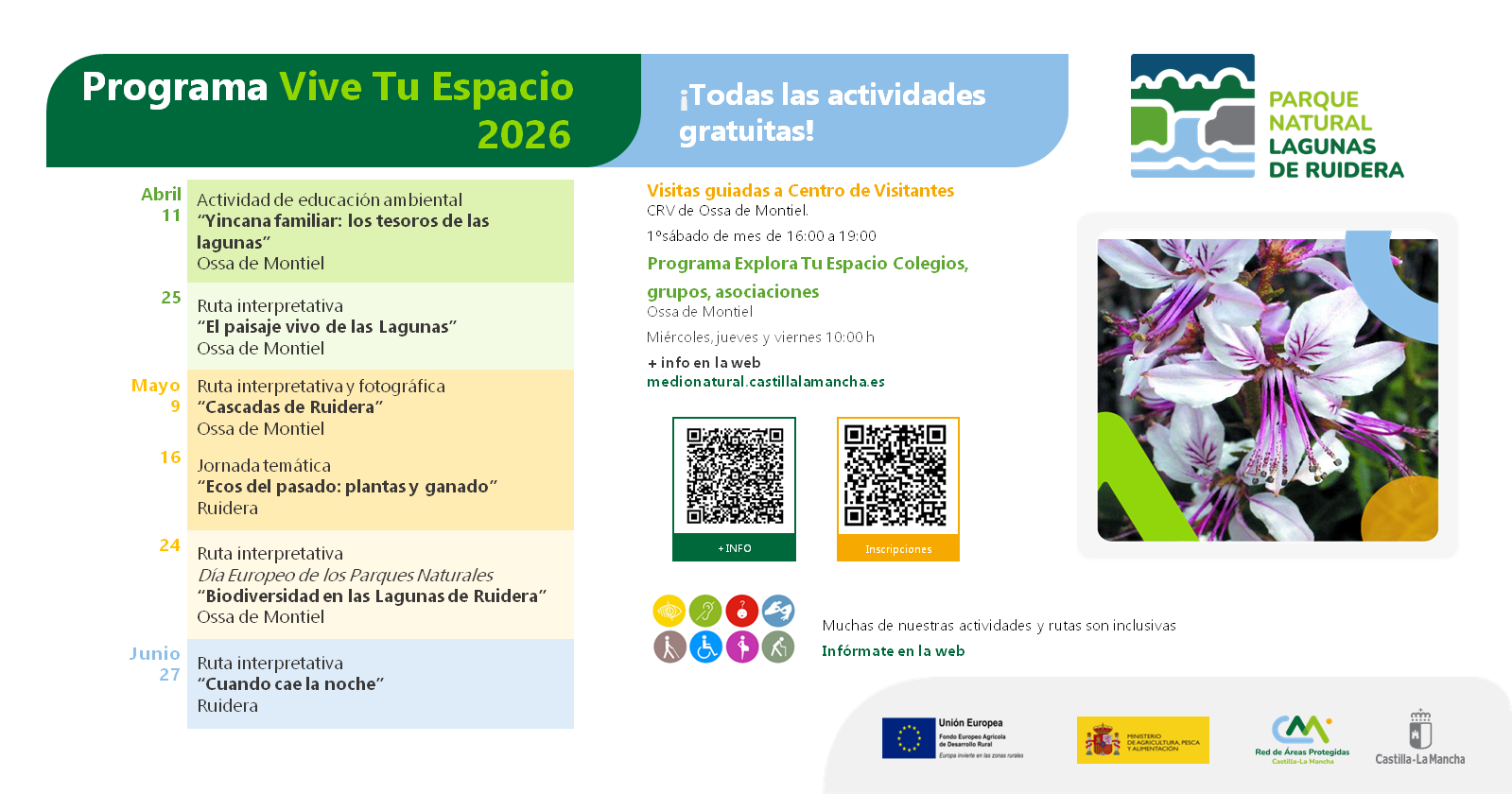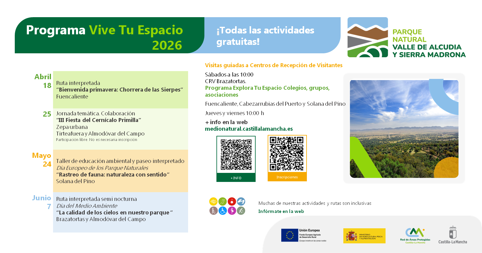 Como ya sabéis, Vive Tu Espacio es un programa de sensibilización e interpretación ambiental de nuestro patrimonio natural que acerca a los visitantes y a la población local los espacios naturales protegidos de nuestra región. Su objetivo es crear una mayor concienciación y ayudar a su conocimiento para poder protegerlos, conservarlos y disfrutarlos de una manera sostenible y ecológica. Todo lo necesario para que disfrutes y conozcas de la mano de personal especializado del sector las maravillas de nuestros espacios naturales.