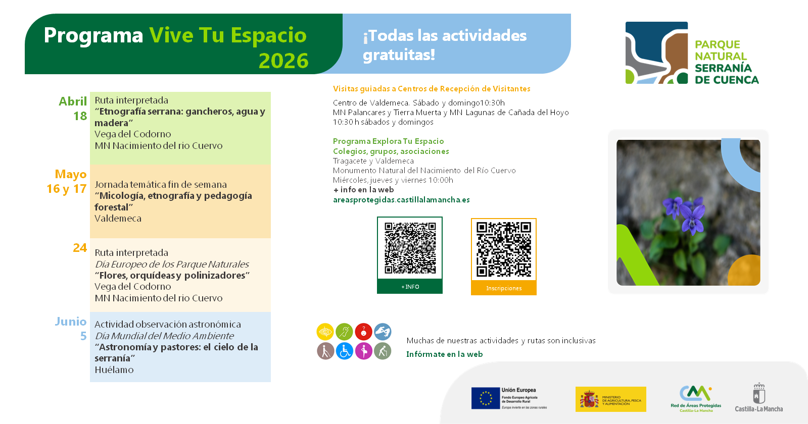Saldremos de ruta por los espacios naturales, observaremos aves y descubrimos nuestra flora y fauna más desconocida; realizaremos rutas en bicicleta y rutas micológicas y de fotografía, diseñaremos nuestros propios cuadernos de campo así como un largo etcétera. Todo ello con el objetivo de VIVIR nuestros espacios naturales protegidos.