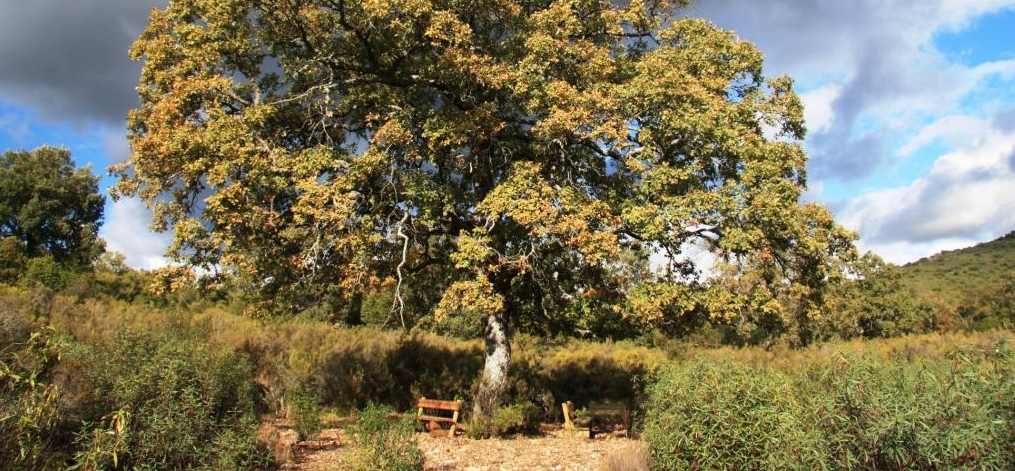 - Descripción: Del aparcamiento una pista desciende al valle del arroyo de La Viñuela al pie de la Sierra del Chorito. A medida que pierde altura, la ruta se interna en la umbría del valle donde abunda un denso sotobosque de madroño, algunos de porte arbóreo, indicándonos que nos encontramos ante un bosque bien conservado. Tras 3 km, surge a la izquierda un camino que baja y se internar en un rodal de robustos rebollos, algunos centenarios. El corto repecho que sigue acaba en el cortafuegos que recorre la solana de la sierra, la vistas sobre la raña de Cabañeros se abren. La ruta sigue el cortafuegos con tramos pedregosos, pasados unos 2,5 km se desvía a la derecha y atraviesa un terreno desarbolado cubierto de jaras. Después de un cruce se alcanza uno de la tramos más bonitos de la ruta, la travesía de un precioso quejigar. El bosque acaba en el cruce de La Hornera, el camino de la derecha devuelve al punto de partida.