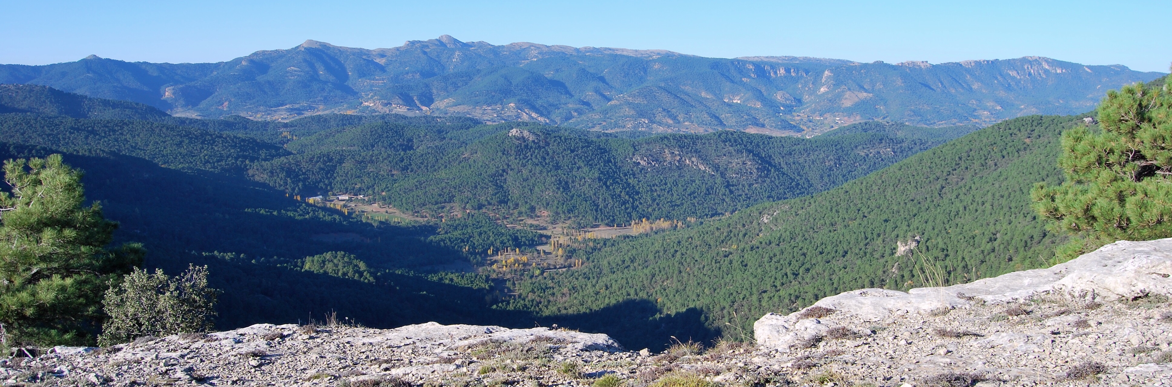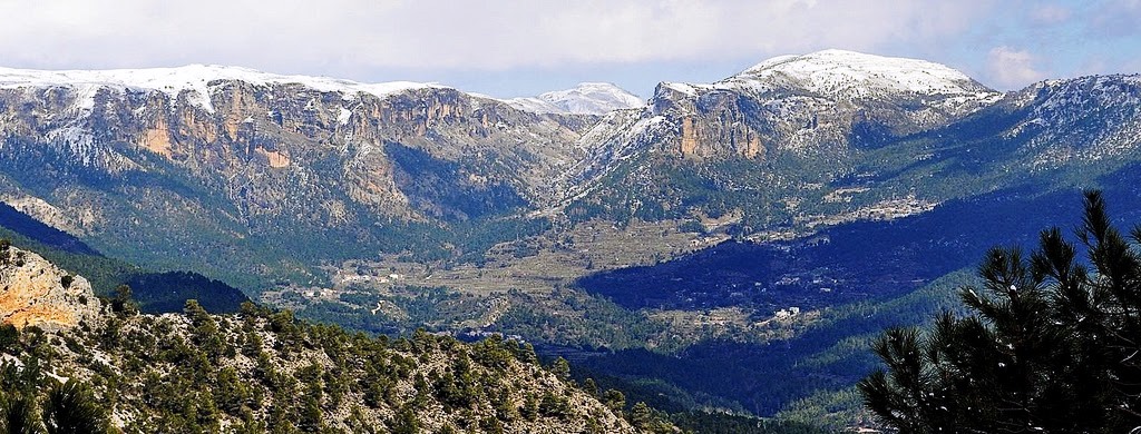 5º Cuenca del río Segura con la mole del Calar de la Sima al fondo que alcanza los 1.897 m de altitud en el pico Mentiras, casi siempre nevada en época invernal. Destacan los escarpes calizos en las partes altas, pinares de pino negral en las medias, y las aldeas serranas con sus zonas de cultivo entreveradas en el paisaje.