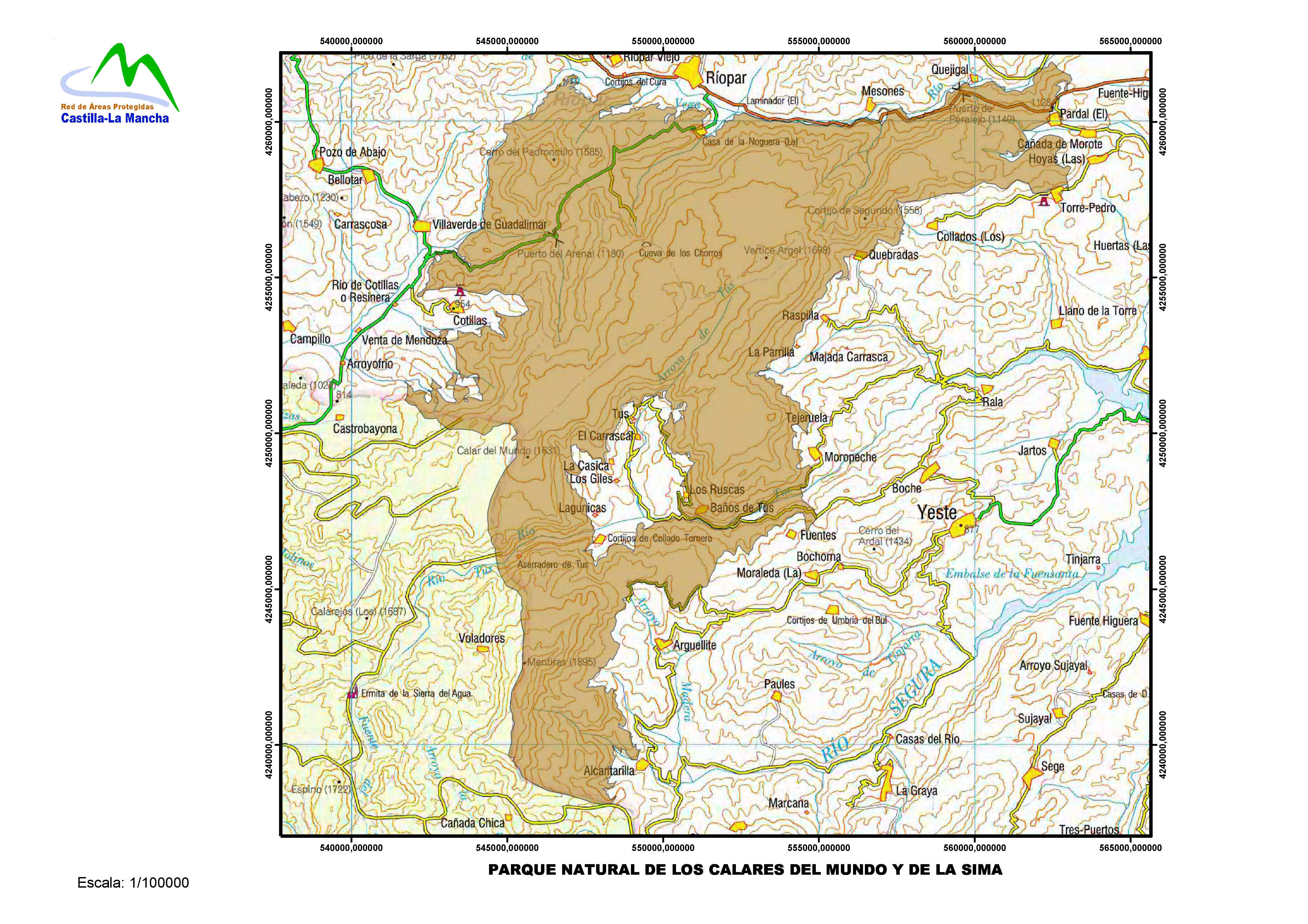 El Parque Natural de Los Calares del Mundo y de la Sima, se encuentra a caballo entre las sierras de Alcaraz y del Segura, en el suroeste de la provincia de Albacete, abarcando parte de los municipios de Yeste, Riópar, MolinIcos, Villaverde de Guadalimar, Vianos y Cotillas. Lo conforman fundamentalmente las Sierras del Calar del Mundo ,Calar de la Sima y Sierra del Cujón; y los valles del río Mundo, el río Tus, el arroyo Frío, El río de La Vega, El arroyo de la Puerta, y el arroyo Madera. El relieve amesetado de sus sierras de naturaleza caliza permite el desarrollo intenso de procesos de disolución kárstica. Estas sierras han desarrollado una flora muy variada y rica en endemismos. Sus principales valores son, por lo tanto, el paisaje, su altísima riqueza en flora endémica y la existencia de un karst muy desarrollado.